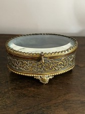 Antique Ormolu Filigree Round Casket Jewellery Trinket Box Bevelled Glass