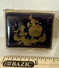 Vintage Cobalt Blue Glass Pill Box Gold Courting Couple 2 Compartment Case