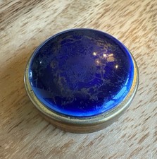 Vintage Pill Box Blue Glass Top with Painted Design Brass Tone