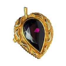 Vintage Florenza Trinket Pill Box Leaf Amethyst Glass Faceted Gold Tone Stash