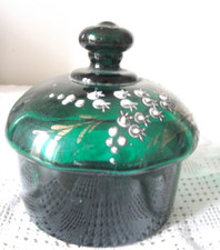 ANTIQUE GREEN GLASS LIDDED TRINKET BOWL - ENAMEL DECORATION (MARY GREGORY?)