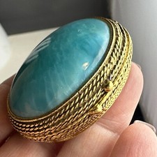 Antique Tiny Cloisonne Pill Box Snuff Aqua Glass Enamel Brass Early 1900s