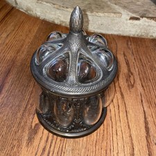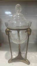 Vintage Crackle Glass Covered Compote Bowl with Ram Head Metal Stand Antique