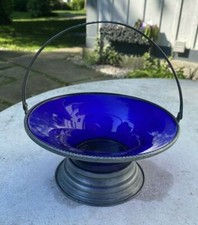 VINTAGE ANTIQUE SILVER PLATE & COBALT BLUE ART GLASS HANDLED BRIDES BASKET