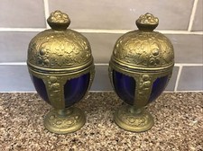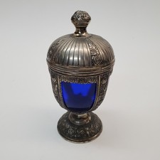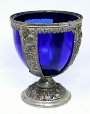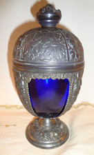 VINTAGE P.N.C.W. CAST METAL CHALICE/COMPOTE w/LID COBALT BLUE GLASS EGG INSERT