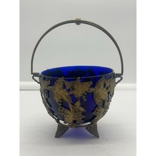 Antique Brass Handled Basket with Cobalt Blue Glass Insert Repousse Grape Leaf P
