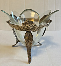 Vintage Tulip Glass Bowl Brass Roses Feather Footed Display Candle Holder Server
