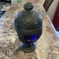 Vintage Antique Spelter Chalice With Lid & Cobalt Blue Glass Insert 8” Tall