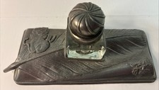 Antique French Etain 94% Pewter Desk Pen Rest Glass Inkwell Vintage