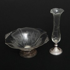 Pair of Antique Sterling & Fluted Glass Pieces, 1 Vase 6-7/8" T & 1 Dish 7" Wide