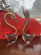 Vintage Patina Brass & Art Bubble Glass Decorative Pair of Swans Pre-owned