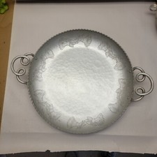 Antique platter, hand hammered/forged, aluminum, deep well, detailed handles.