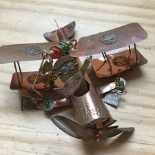 Vintage 1970s Copper Propeller Biplane Airplane W/ Pilot Hanging Toy Ornament