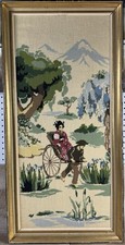 Japanese Geisha Vtg Needlepoint Framed Large 37" Rickshaw Mountain Completed