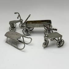 Pewter Miniature Doll House Toys Set of 4 Silver Vintage - Tricycle Sled Wagon