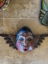 Antique MEXICAN GUERRERO FOLK ART CARVED WOOD ANGEL PUTTI Cherub MASK VTG 16" )