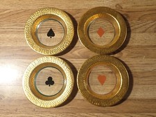Set of 4 Vintage Glass & Brass Playing Cards Coaster Nut Dish Spade Heart Club +