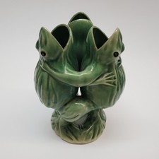 Vintage Green Ceramic Dancing Frogs Vase Made in Japan 8" Mid-Century Pottery