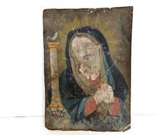 Antique Mexican Retablo Folk Painting, Oil on Tin Madonna & Child 5”x7" 19th Cen