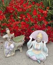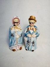 PAIR ANTIQUE FLOW BLUE & LUSTER PORCELAIN NODDERS women with hats and baskets
