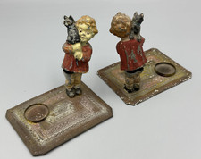 Antique BOBBLEHEAD Cast Metal Nodder CANDLE HOLDERS Girl & Cat AUSTRIA
