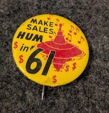 Vintage Make Sales Hum In 61 Button - Promo Ad 1960s Spinning Top Toy Pin Pun