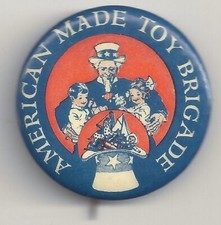 Vintage Celluloid Pin American Made Toy Brigade Uncle Sam & Kids w/ backpaper