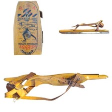 Antique wooden ice skates with leather straps and steel runners