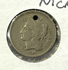 1865 CIVIL WAR Three 3 Cent Piece Coin Nickel 3C Nice Details HOLE Holed Antique