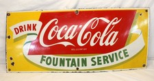 💥50's COCA COLA : FOUNTAIN SERVICE Soda PORCELAIN ADVERTISING Sign 12"x28" 💥