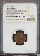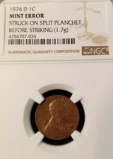1974 D LINCOLN CENT 1C NGC MINT ERROR STRUCK ON SPLIT PLANCHET BEFORE STRIKING