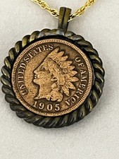 Genuine 1905 USA Indian Head 1 Cent Penny Coin Pendant Necklace Golf Tone Old