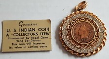 Vintage 1905 Indian Head Cent Penny Coin Rhinestone Gold Tone Round Pendant 40mm