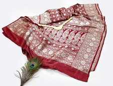 Indian Antique Vintage Heavy Sari Maroon Pure Silk Hand Woven Banarasi Saree 5yd