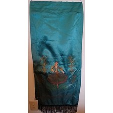 Vintage Hand Painted Greece Greek Scarf Issues Teal Blue Black Fringe Oblong