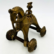 Antique Solid Brass INDIA TEMPLE TOY Deity Riding Rolling Horse on Wheels