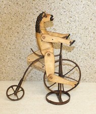 Vintage Jointed Wood Horse Riding a Metal Bicycle Figurine Toy - 10.5"H