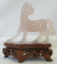 ANTIQUE CHINESE ROSE QUARTZ STANDING HORSE ON WOOD BASE #1