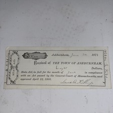 Antique 1873 Signed Receipt for State Aid - Town of Ashburnham Massachusetts MA