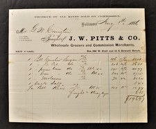1866 antique J W PITTS & Co baltimore md RECEIPT handwritten grocers sugar rice