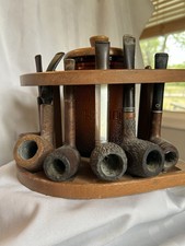 Vtg Walnut Wood 9 Pipe Stand Holder Glass Tobacco Humidor +9 Pipes Filtrex READ