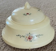Vintage Cream Plastic Powder Puff Music Box with Lid Painted Roses Vanity