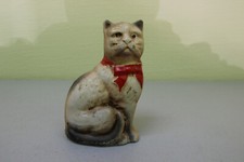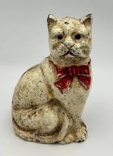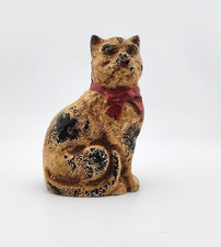 Vtg Antique Painted Cast Iron Metal Cat with Red Bow Bank/Doorstop 4” Figure
