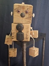 Block Guy - Wooden Toy Hand Crafted Art w Vintage Door Bell Tummy - Extra Large