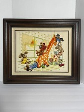 Vintage Playtime for Toys Crewel Embroidery Nursery Art Framed 26” X22” 80’s J1