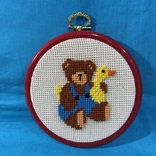 Vintage 1980s Teddy Bear & Duck Needlepoint In Red Frame.