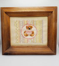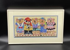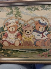 Vintage embroidered Needlepoint Teddy Bears wood Framed Wall Art Adorable