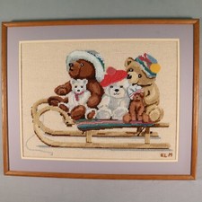 Vintage Needlepoint Needle Work Sledding Teddy Bears Hand Made Framed 23X18