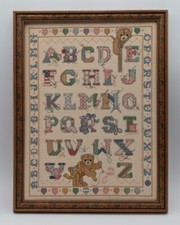 Vintage Framed Completed ABC's Cross Stitched Teddy Bears 17 X 13-1/4"