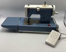 Vintage Toy Blue White Metal Sewing Machine Battery Operated With Pedal